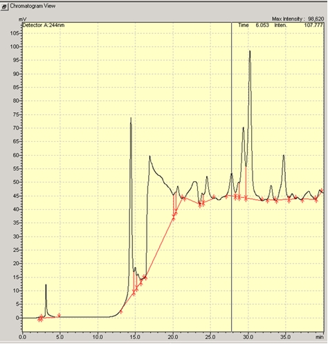 Nós gráficos obtidos após realização, foi possível a visualização do tempo de retenção (Rt) do soluto 2-hidroxi-1,4-naftoquinona para a amostra Floral Proteção e Equilíbrio (2), mostrando que esse constituinte pode servir como marcador químico em análise qualitativa para certificação deste floral.