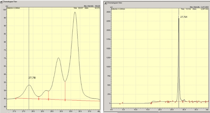Cromatograma da amostra bruta do Floral Proteção e Equilíbrio (2). Volume injetado = 20 uL. (Rt) de 27,78 min.
